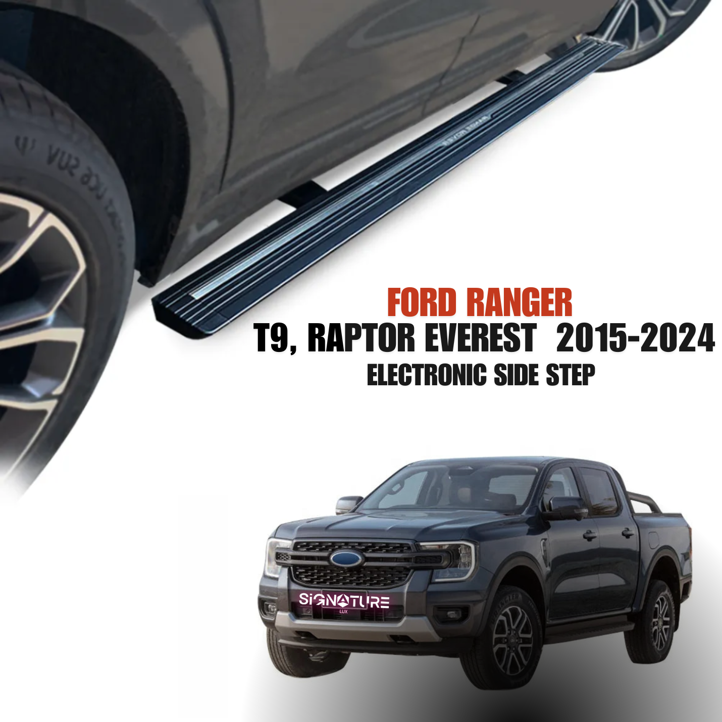 Acelera tu viaje y saluda a la entrada más suave jamás vista con nuestro estribo lateral eléctrico con tira de LED para Ford Ranger T9, Raptor, Everest (2015 - 2024).